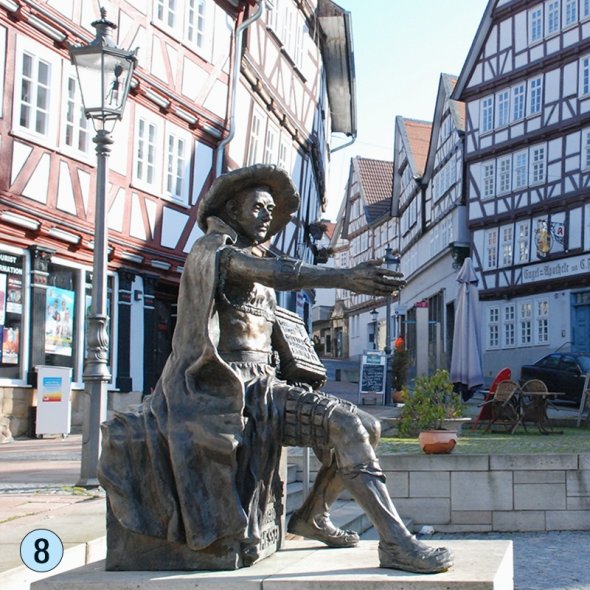 Auf dem Marktplatz treffen wir auf das Denkmal Landgraf Philipps des Großmütigen (8), der 1526 die Homberger Synode in der Marienkirche einberief und anschließend die Reformation in Hessen einführte. Auch dieses Bronzedenkmal ist das Werk von Ewald Rumpf.