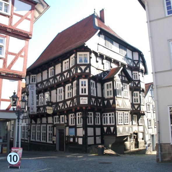 Links an der Ecke zur Entengasse und Holzhäuser Straße sehen wir die „Krone“ (10), eines der ältesten Gasthäuser Hessens. Das imposante Fachwerkhaus stammt aus dem Jahr 1480 und ist somit eines der ältesten noch stehenden Häuser Hombergs, da es im Dreißigjährigen Krieg unter besonderem Schutz stand und deshalb verschont wurde.