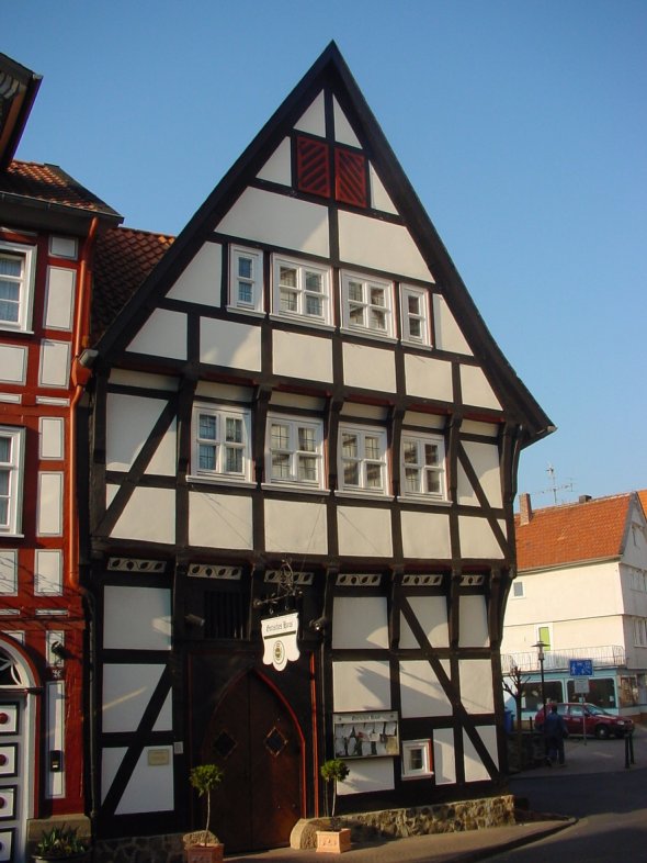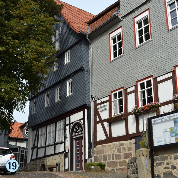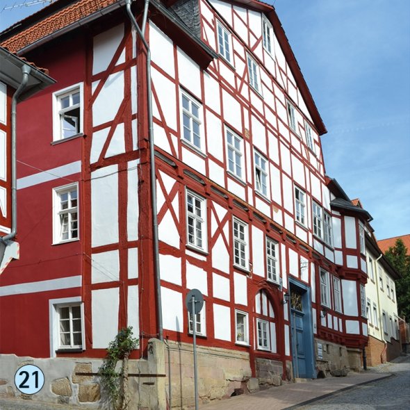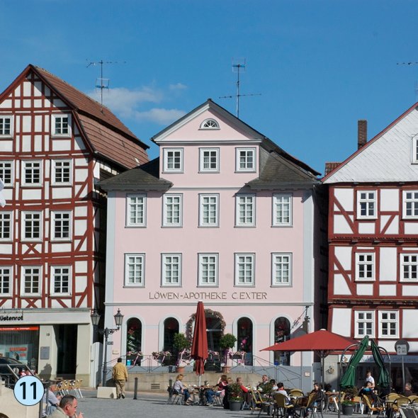 Ein paar Schritte weiter befindet sich auf der rechten Seite das größte Fachwerkhaus am Marktplatz, die „Engelapotheke“ (12), errichtet im Jahr 1668. Heute beherbergt sie das „Haus der Reformation“ und das „HohenburgMuseum“.