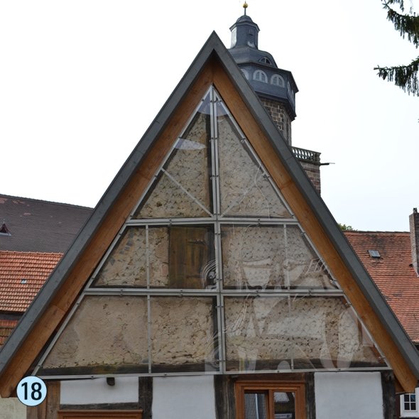 Wir biegen in die Webergasse ein und gehen bis zum Haus des Schultheissen (30), das sich auf der rechten Seite an der Ecke zur Holzhäuser Straße befindet. Das große Haus stammt aus dem 16. Jh. Eine Sandsteintafel mit Engel und Schwert könnte auf die Funktion als Wohnung des Schultheissen hinweisen