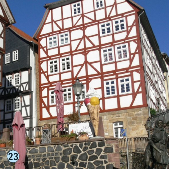 Gleich daneben passieren wir das alte Schulhaus (23), ein Fachwerkgebäude aus dem 18. Jh. Ludwig Mohr unterrichtete an der im 19. Jh. hier untergebrachten Höheren Töchterschule.