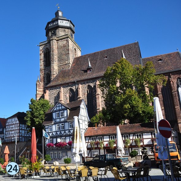Der Stadtrundgang führt uns nun zu einer der wichtigsten Sehenswürdigkeiten Hombergs, der Stadtkirche St. Marien (24), auch Reformationskirche genannt, weil hier 1526 die Homberger Synode stattfand. Die evangelische Stadtkirche St. Marien zählt zu den schönsten gotischen Baudenkmalen in Nordhessen. Der Bau der dreischiffigen Hallenkirche wurde etwa 1340 begonnen. Eine Tafel neben dem Hauptportal verweist auf den Turmbaubeginn in 1374, eine weitere Erinnerungstafel an das Ereignis der Synode. Im Innern der Kirche ist vor allem das Reformationsfenster mit der Darstellung der Homberger Synode im Chor bemerkenswert, sowie die Reliefs der Kreuzweg-Stationen im nördlichen Seitenschiff.