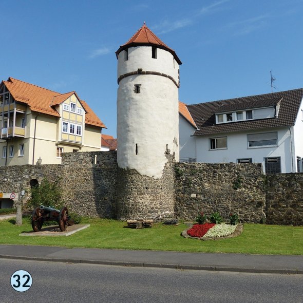 Die nächste Sehenswürdigkeit des Rundganges ist einer der beiden noch erhaltenen Wehrtürme, der so genannte Pulverturm (32). Er war seit dem 13. Jh. Bestandteil des Mauerrings der Befestigungsanlage und diente früher auch als Gefängnisturm.