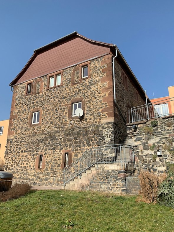 Gegenüber befindet sich der Burgsitz von Baumbach (19), 1543 von Ludwig von Baumbach erbaut und von 1840 bis 1855 hatte hier die Taubstummenschule ihren Sitz. Heute wird das Gebäude von der evangelisch-lutherischen Gemeinde als Jugendgästehaus genutzt.