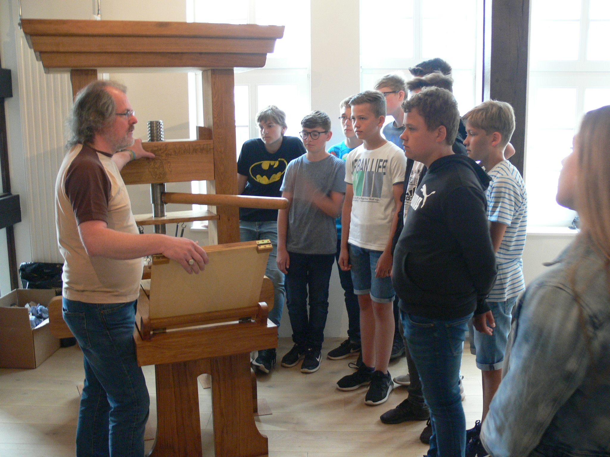 Früher mussten Mönche von Hand jedes Buch mit einer Rohrfeder oder einem Gänsekiel schreiben. „Illuminatoren“ malten anschließend Initialen und Bilder. So brauchten sie für eine einzige Bibel mehrere Jahre. Um 1450 erfand Johannes Gutenberg in Mainz den Buchdruck. Dabei wurden die einzelnen Buchstaben von Hand in einen „Winkelhaken“ gesetzt. Eine nach wie vor zeitraubende Angelegenheit – jedoch um vieles schneller als das Abschreiben von Hand. Beim Workshop wird das Handlettering der Mönche ausprobiert und der Buchdruck auf dem Nachbau der Gutenberg-Presse lebendig. Die teilnehmenden Gruppen werden geteilt in „Übungen im Handlettering“ und „Arbeiten an der Druckpresse“.