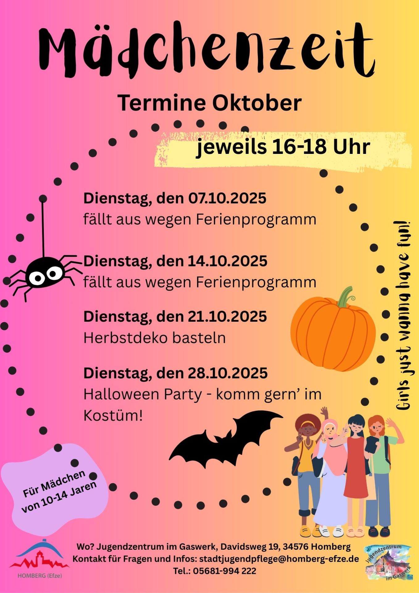 In den Ferien pausiert die Mädchenzeit. Danach geht es für alle Mädels von 10-14 Jahren wieder los. Es wird gruselig schön. Kommt vorbei.