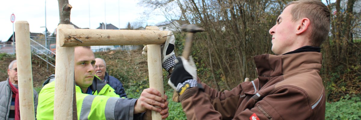 Der Boden des Areals erwies sich als steinig und musste mit der Spitzhacke und zahlreichen helfenden Händen, insbesondere durch die Mitarbeiter der Technischen Betriebe Homberg, gelockert werden. Landschaftsgärtner Christian Vaupel, Jens Apel und Jannik Richard machten sich an die Arbeit und halfen ein großes Loch auszuheben. Und so konnte der „Baum des Jahres 2024“, der sich sehr resistent gegenüber Trockenheit zeigt, im Pflanzloch versenkt werden. Erde drauf und zur Stabilisierung und Schutz des Baumes noch schnell eine Baumstütze (Dreibockanbindung) gebaut, so stand der neue Baum. Einfach schön anzusehen.