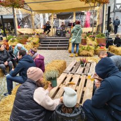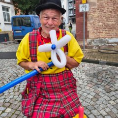 Im Kochs in der Untergasse sponn Benjamin Altmann mit seiner Spinngruppe im Begegnungscafè der Gemeinswesenarbeit, ab 11:30 Uhr bot das Jugendzentrum im MachWerk Bastelaktionen für Kinder an und schon ab 11 Uhr stand in der Untergasse die Hüpfburg von Clown Toni Clowni alias Hans Guderjahn bereit, damit die Kids ihren Bewegungsdrang ausleben konnten. Er überraschte mit bunten Kreationen aus Luftballons und schuf kleine Tiere und Blumen. Ein Kinderschminken rundete dort das Kinderaktionsangebot des Herbstmarktes ab.