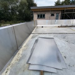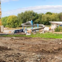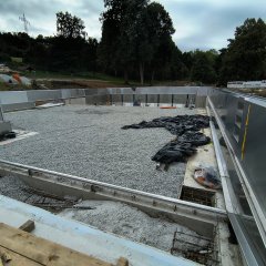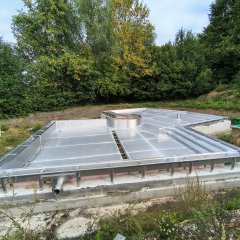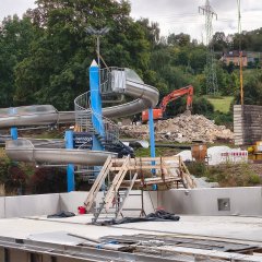 Der Stahlboden des neuen Kinderplanschbeckens ist installiert worden und das Becken ist in seiner Grundkonstruktion fertig. Im großen Schwimmbecken sind die äußeren Stahlwände gestellt und restliche Seitenteile werden eingebaut. Die Bodenfläche des zukünftigen Beckens wurde mit Beton ausgegossen. Bald folgt der Einbau des Edelstahlbodens und der Rohrleitungen.