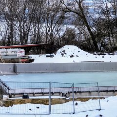 Die einzige Firma, die momentan tätig ist, ist die Firma Diehl (Wärmeanlagen), die unten in den Technikräumen des Umkleidegebäudes arbeitet. Hier wird die Technik weiter installiert. Geduldig sein und Warten sind gefragt, bis es nach dem Winterwetter endlich weitergehen kann. (di)