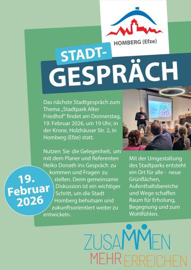 Das nächste Stadtgespräch zum Thema „Stadtpark Alter Friedhof“ findet am Donnerstag, 19. Februar 2026, um 19 Uhr, in der Krone, Holzhäuser Str. 2, in Homberg (Efze) statt.