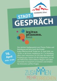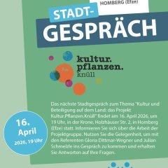 Bereits jetzt dürfen sich Interessierte auf die nächste Veranstaltung freuen: Am 16. April 2026 um 19:00 Uhr lädt das Stadtgespräch erneut in die Krone ein. Dann steht das Thema „Kultur und Beteiligung auf dem Land: das Projekt Kultur.Pflanzen.Knüll“ im Fokus. Mit Gloria Dittmar-Wegner und Julian Schmelzle stehen kompetente Ansprechpartner bereit, die Einblicke in die Projektarbeit geben und den Dialog mit dem Publikum suchen. Eine gute Gelegenheit also, sich zu informieren, Fragen zu stellen und aktiv am kulturellen Leben der Region teilzuhaben. (di)