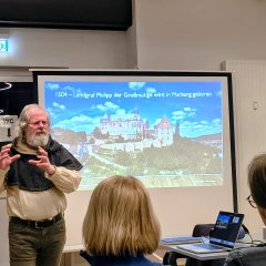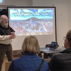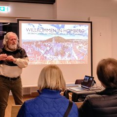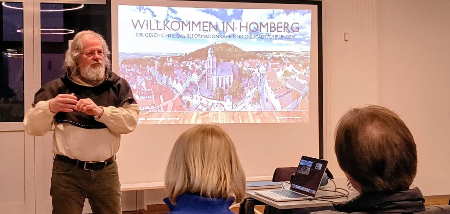 Mit großer Sachkenntnis und spürbarer Begeisterung nahm Luthardt sein Publikum mit auf eine Reise durch die Vergangenheit von Homberg (Efze). Dabei spannte er den Bogen von historischen Entwicklungen bis hin zum Reformationsjubiläum und gab mit einer virtuellen Turmführung zugleich spannende Einblicke in seine Arbeit als Stadtführer und Türmer. Seine anschaulichen Schilderungen und persönlichen Anekdoten sorgten für eine angenehme Atmosphäre und regten immer wieder zum Nachfragen und Austausch an. Der über fast zwei Stunden dauernde Vortrag war kurzweilig und bot immer wieder Gelegenheit, zum Nachfragen.