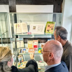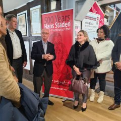 Gemeinsam mit Vertreterinnen und Vertretern aus Homberg besichtigte die Delegation die Ausstellung über das Leben und Wirken Hans Stadens, die Teil der Darstellung der Reformationsgeschichte der Stadt ist.