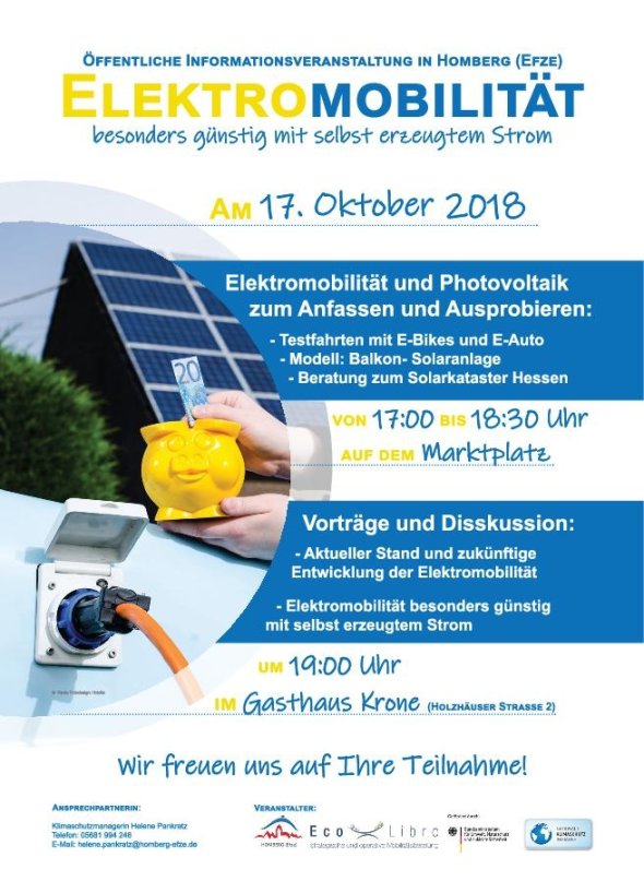 Am 17. Oktober 2018 wurde im Rahmen der Erarbeitung des Elektromobilitätskonzepts eine Veranstaltung zum Thema „Elektromobilität besonders günstig mit selbst erzeugtem Strom“ in Kooperation mit den Büros EcoLibro aus Troisdorf und KEEA aus Kassel sowie dem örtlichen Fahrradhändler Rothauge durchgeführt.