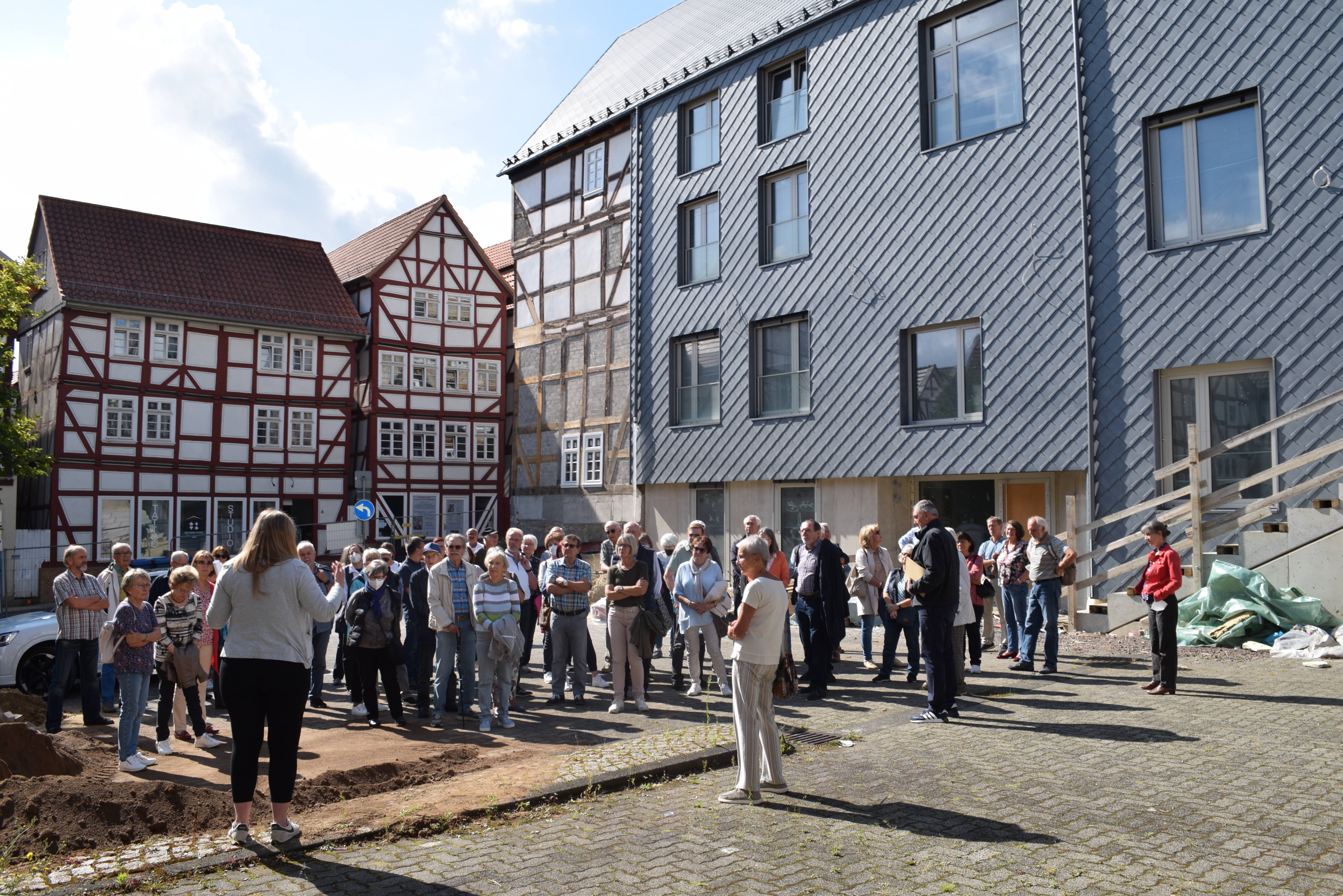 Bei mehreren Baubesichtigungen führte Architektin Christine Hess vom Architekturbüro Hess aus Neuenstein durch das Haus. „Auf einer Geschossfläche von insgesamt 1.050 Quadratmetern stehen insgesamt 35 Räume zur Verfügung“, informiert die Architektin die Teilnehmerinnen und Teilnehmer bei der Führung am Tag der Städtebauförderung.