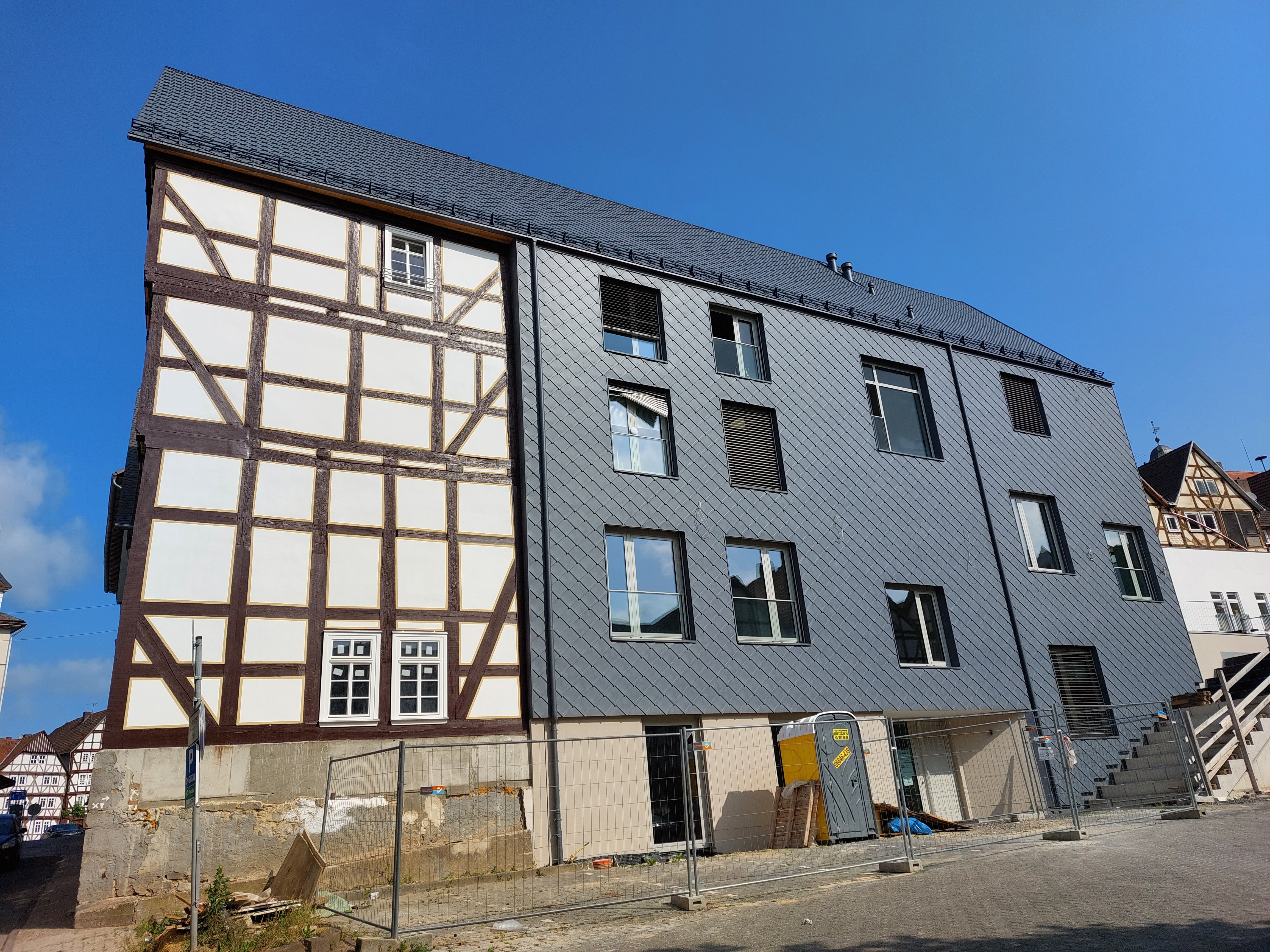 „Wir haben bei der Planung den Dachstuhl des Fachwerkgebäudes Holzhäuser Straße 3, obwohl er sehr angegriffen wirkte, erhalten. Durch die Firsthöhe des Gebäudes konnten wir die Firsthöhe des Neubaus auch höher planen und erhielten so im Neubau mehr Raumvolumen“, erklärt Christine Hess.