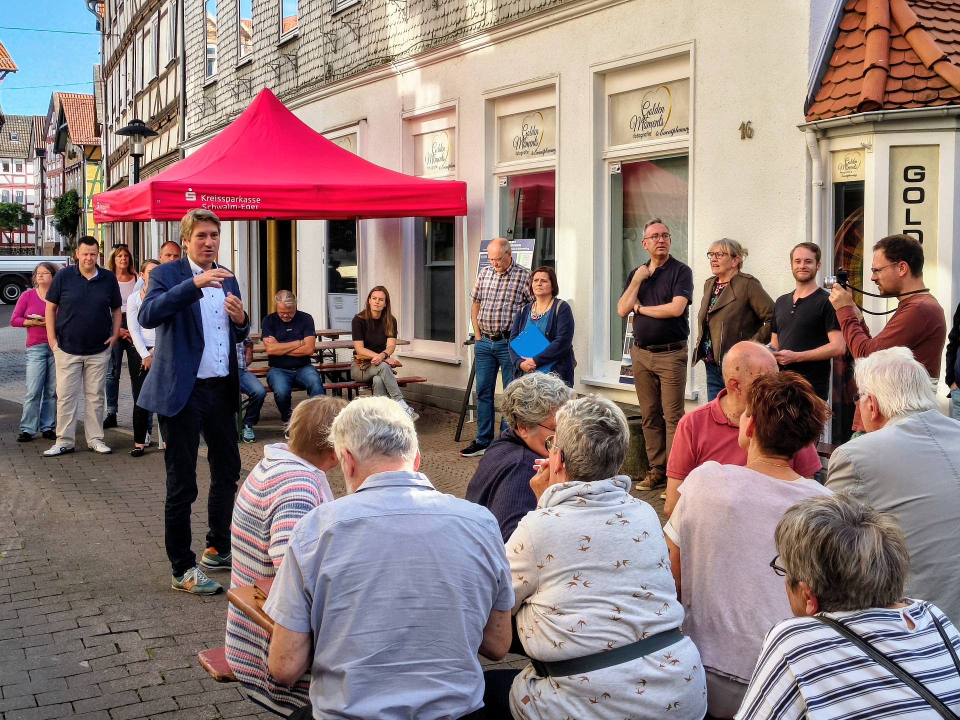 Im KOCHS, der neuen Zentrale des WANDELpfads in den leerstehenden Räumen des gleichnamigen Schuhhauses, traf sich die Gruppe anschließend mit den Akteuren, welche mittlerweile ein vielfältiges Angebot an Veranstaltungen und Aktionen, wie zum Beispiel offene Barabende, die Stadtlabor-Spaziergänge oder die Sundowner auf der Burg durchführen. Im anschließenden Gespräch über bisher Erreichtes und die in 2023 geplanten Projekte und Aktionen wurde deutlich, dass die Fortschritte des Projekts von allen Beteiligten als sehr positiv wahrgenommen werden und Homberg (Efze) auch im Vergleich mit den anderen 16 Pilotprojekten sehr gut vorankommt.